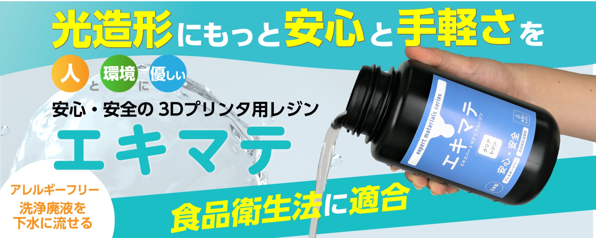 ”光造形にもっと安心と手軽さを。”食品衛生法に適合した”人と環境に優しい”日本製アレルギーフリー水洗いレジン「エキマテ」